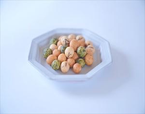 落花生中心にした豆菓子で味付けは磯の三つ(青海苔・海苔・海老)の香りで味付けしました。
